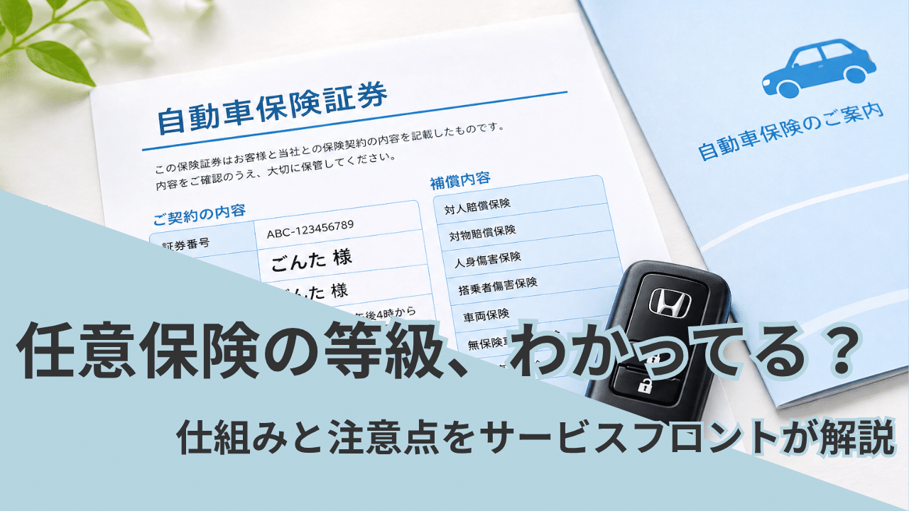 任意保険の等級制度、名前は聞いたことがあっても仕組みがよくわからない方は多いです。等級が下がると保険料がどのくらい変わるのか、「事故あり係数」って何なのか、保険会社を乗り換えたら等級はどうなるのか。この記事では現役ディーラースタッフのごんたが、難しい言葉なしでやさしく解説します。読み終わったら等級のことがスッキリ理解できますよ。